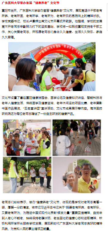 重阳佳节,伟德bv1946官网首届“健康养老”文化节盛大启幕,成为校园内一道亮丽的风景线,展现出离退休干部们积极向上的精神风貌,受到广泛关注,南方 + 和广东老干部等媒体纷纷进行报道。