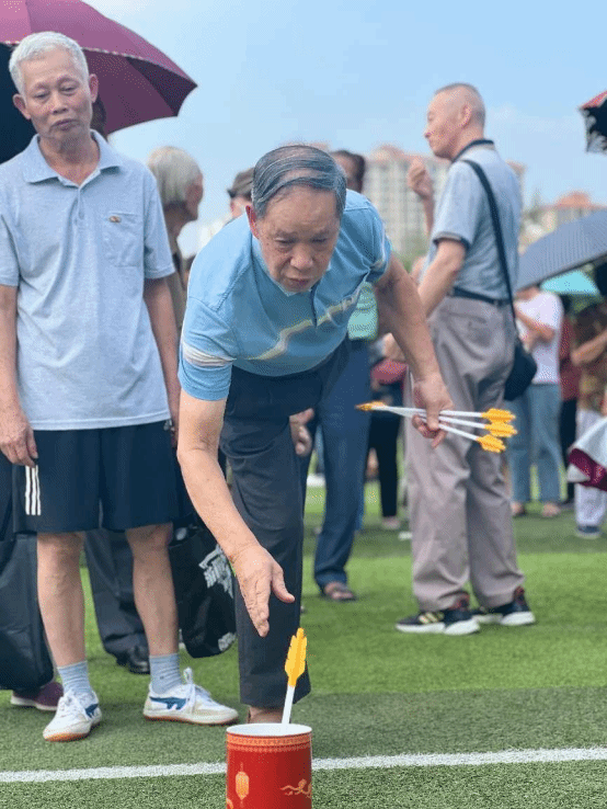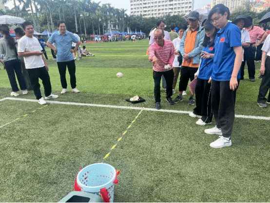 下午的“投壶”“投沙包”项目在湛江校区深受欢迎,投壶项目中,教职工们站在规定位置,将手中的箭矢投向壶中,传统游戏的魅力在这一刻展现无遗。投沙包项目则充满了童真,老人们重温儿时的欢乐,用力将沙包投出,现场一片热闹景象。
