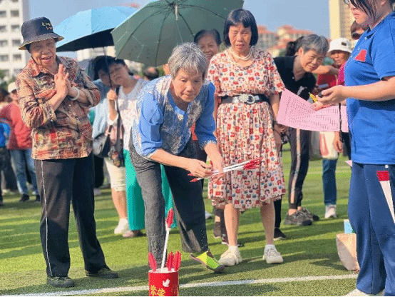 而在东莞校区,竞赛项目也是精彩纷呈。竞赛项目包括:射飞镖、保龄球、快乐飞碟、投沙包射飞镖项目中,老年人手持飞镖,眼神专注地瞄准镖盘,每一次投掷都带着期待,飞镖命中镖盘的那一刻,无论是高分还是低分,都能引发周围人的欢呼。 投沙包项目更是勾起了老年人的童年回忆,尽情享受这简单而纯粹的快乐。